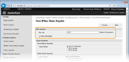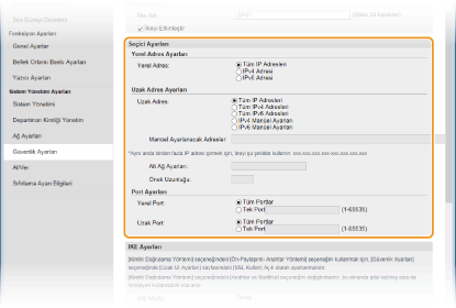 IPSec uygulanacak tek bir IPv4 adresi veya IPv4 adresleri aralığı belirtmek için seçin. [Manüel Ayarlanacak Adresler] Metin kutusuna IPv4 adresini (veya aralığı) girin.