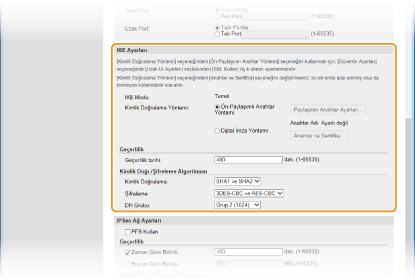 [Kimlik Doğrulama Yöntemi] için [Ön-Paylaşımlı Anahtar Yöntemi] radyo düğmesini ve [Paylaşılan Anahtar Ayarları] öğesini tıklatın.