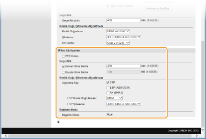 ESP için şifreleme algoritmasını seçin. Algoritma belirtmek istemiyorsanız [BOŞ] seçeneğini belirleyebilir veya ESP şifrelemesini devre dışı bırakmak istiyorsanız [Kullanma] seçeneğini belirleyebilirsiniz.