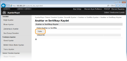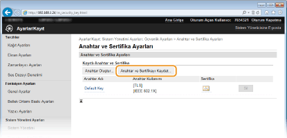 Bir anahtar çiftini yüklemek için [Anahtar ve Sertifika Ayarları] öğesini ya da bir CA sertifikasını yüklemek için [CA Sertifikası Ayarları] öğesini tıklatın.