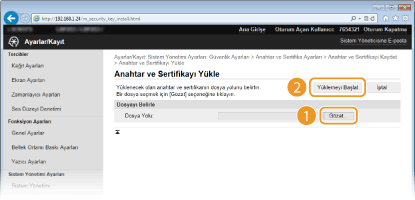 Anahtar çiftleri ve dijital sertifikalar, makineyle kullanım için bir sertifika yetkilisinden (CA) alınabilir. Uzak Kullanıcı Arabirimi'ni kullanarak bu dosyaları saklayabilir ve daha sonra kaydedebilirsiniz. Anahtar çifti ve sertifikanın, makinenin gereksinimleri karşıladığından emin olun (