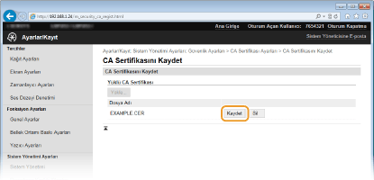 Bir anahtar çifti, [Anahtar Kullanımı] altında "[TLS]" veya "[IEEE 802.1X]" görüntülendiğinde olduğu gibi, geçerli olarak herhangi bir amaçla kullanılıyorsa silinemez. Bu durumda, anahtar çiftini silmeden önce işlevi devre dışı bırakın veya anahtar çiftini değiştirin. Önceden yüklü olan CA sertifikası silinemez.