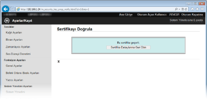 Bir anahtar çiftini doğrulamak için [Anahtar ve Sertifika Ayarları] öğesini ya da bir CA sertifikasını doğrulamak için [CA Sertifikası Ayarları] öğesini tıklatın.