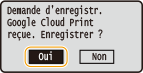 Vous pouvez également enregistrer l'appareil depuis un terminal mobile ou Google Chrome. L'écran de l'appareil affiche l'écran de confirmation ci-après avant la fin de l'enregistrement. Appuyez sur <Oui> pour terminer l'enregistrement.