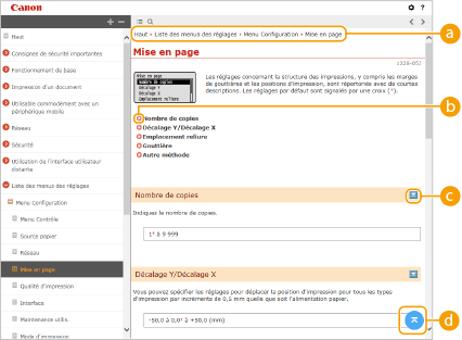Cliquez pour régler les paramètres afin de déterminer comment le Manuel électronique est affiché, comme la taille de caractère ou la disposition.