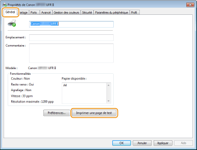 Cliquez sur [Imprimer une page de test] dans l'onglet [Général].