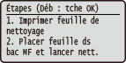 Des saletés peuvent adhérer à l'unité de fixation à l'intérieur de l'appareil et laisser des traînées noires sur les impressions. Pour nettoyer cette pièce, suivez la procédure ci-après. Notez que vous ne pouvez pas nettoyer l'unité de fixation si des documents sont en attente d'impression. Pour nettoyer l'unité de fixation, vous avez besoin de papier ordinaire au format A4 ou Lettre. Placez-le dans la cassette à papier ou dans le bac multifonctions (