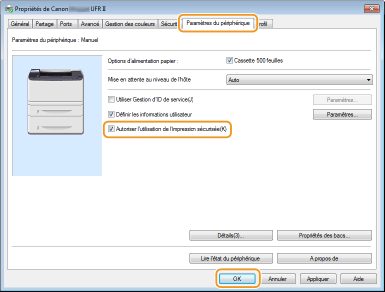 Cliquez sur l'onglet [Paramètres du périphérique], puis assurez-vous que la case [Autoriser l'utilisation de l'impression sécurisée] est cochée.