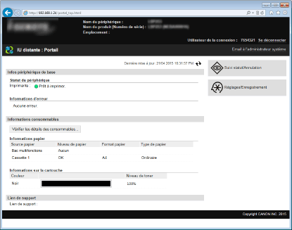 Vous pouvez vérifier l'état des documents ou de l'appareil et modifier certains réglages. Si vous désirez supprimer les documents imprimés, renseignez le nom de l'utilisateur associé aux documents dans [Nom d'utilisateur]. Le nom d'utilisateur est automatiquement défini pour les documents imprimés selon les informations telles que le nom de l'ordinateur ou le nom de connexion à l'ordinateur.