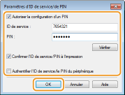 Cochez la case pour afficher la fenêtre contextuelle [Confirmez l'ID de service et le PIN] à chaque fois que vous lancez une impression à partir d'un ordinateur.