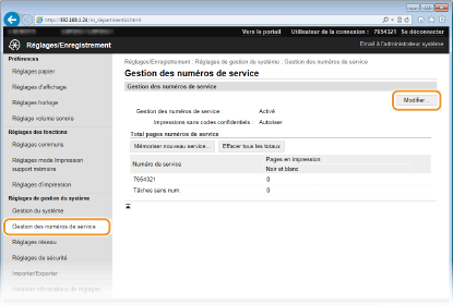 Cliquez sur le lien correspondant figurant sous [Numéro de service] pour modifier le numéro.