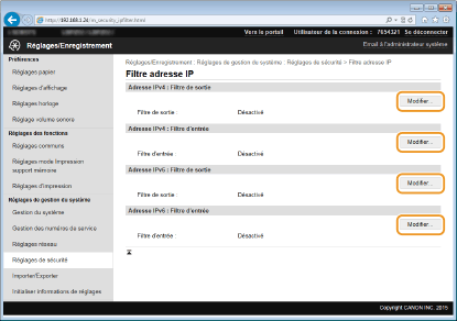 En cas de saisie incorrecte des adresses IP, vous risquez de ne pas pouvoir accéder à l'appareil via l'interface utilisateur distante. Si cela devait se produire, il faudrait définir <Filtre d'adresse IPv4> ou <Filtre d'adresse IPv6> sur <Désactivé>. Filtre d'adresse IPv4 Filtre d'adresse IPv6