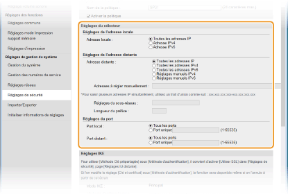 Permet de spécifier une adresse IPv6 unique ou une plage d'adresses IPv6 auxquelles appliquer IPSec. Saisissez l'adresse IPv6 (ou la plage d'adresses) dans la zone de texte [Adresses à régler manuellement].