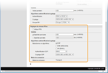 Spécifiez les réglages [Valide pendant] et [Authentification]/[Cryptage]/[Groupe DH]