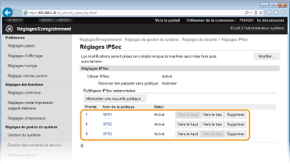 Utilisation du panneau de commandeVous pouvez également activer ou désactiver la communication IPSec en appuyant sur