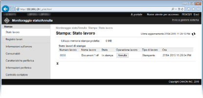 La IU remota consente di gestire la macchina da remoto dal computer sulla scrivania. È possibile verificare le quantità rimanenti di carta e toner nella cartuccia, nonché controllare lo stato attuale dei lavori di stampa per decidere se è necessario interrompere temporaneamente i lavori di stampa per stampare documenti urgenti o far avanzare dei documenti tra quelli in attesa di essere stampati. Risparmiare tempo senza avere problemi, eliminando i "viaggi" tra la scrivania e la stampante.