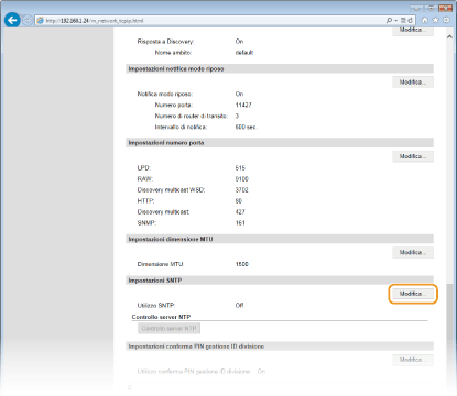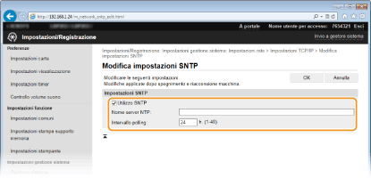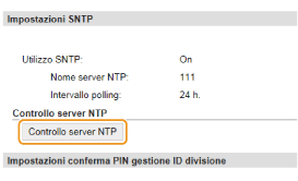 Verifica della comunicazione con il server NTP/SNTPÈ possibile visualizzare lo stato della comunicazione con il server registrato facendo clic su [Impostazioni/Registrazione]