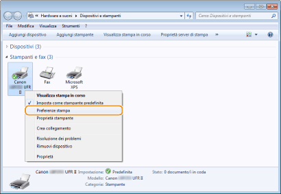 Fare clic con il pulsante destro del mouse sull'icona della stampante, quindi fare clic su [Preferenze stampa].