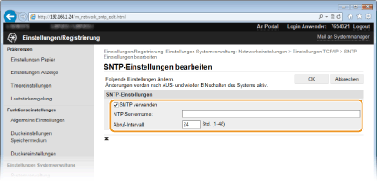 SNTP (Simple Network Time Protocol) ermöglicht die Einstellung der Systemuhr über einen Zeitserver im Netzwerk. Wenn Sie SNTP verwenden, überprüft das System den Zeitserver regelmäßig und sorgt auf diese Weise für eine stets genaue Systemzeit. Die Zeit wird auf der Grundlage der koordinierten Weltzeit (UTC, Universal Time Coordinated) eingestellt; Sie müssen also die Zeitzone angeben, bevor Sie SNTP konfigurieren (Einstellungen Datum/Zeit). Sie können die SNTP-Einstellungen über Remote UI festlegen.