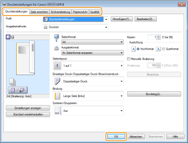 Klicken Sie auf die Registerkarte [Grundeinstellungen], [Seite einrichten], [Endverarbeitung], [Papierzufuhr] oder [Qualität], um gegebenenfalls die entsprechenden Druckeinstellungen vorzunehmen.
