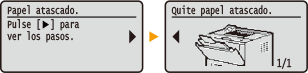 En algunos casos, cuando se produce un error, aparecen las instrucciones sobre cómo responder ante dicho error. Siga las instrucciones de la pantalla para solucionar el problema. La pantalla que aparece cuando se produce un atasco de papel se muestra a continuación a modo de ejemplo.