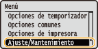 Todas las opciones sobre el ajuste y el mantenimiento se muestran con descripciones breves. Las opciones predeterminadas aparecen marcadas con una cruz (