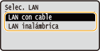Seleccione <LAN con cable> o <LAN inalámbrica>, y pulse