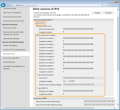 Las direcciones IPv6 del equipo pueden configurarse a través de la IU remota. Antes de configurar direcciones IPv6, compruebe las opciones de la dirección IPv4 (Visualización de las opciones de IPv4). Debe establecer las opciones de IPv4 correctas para poder utilizar direcciones IPv6. El equipo puede utilizar hasta nueve de las siguientes direcciones IPv6: