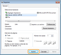 [Dispositivos] [Imprimir] la impresora que está usando pulse o haga clic en [Imprimir]Si imprime utilizando este método, únicamente se encontrará disponible un número limitado de opciones de impresión.