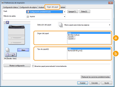El origen del papel se seleccionará automáticamente en función del tamaño y el tipo de papel especificado para la impresión y las opciones configuradas en el equipo.