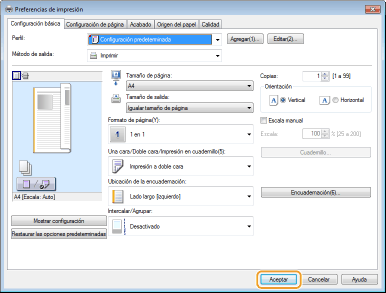 Podrá especificar fácilmente el formato de página, la posición de encuadernación, etc. de una forma intuitiva en la imagen de vista preliminar.Para obtener más información, haga clic en [Ayuda] en la pantalla del controlador de impresora.