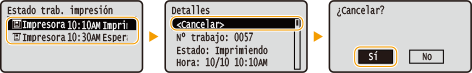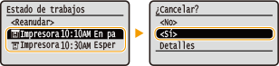 Cancelación desde la IU remotaPuede cancelar la impresión desde la página [Estado de trabajos] de la IU remota: Comprobación del estado actual de los documentos de impresión