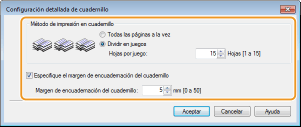 [Dividir en juegos]: imprime varios paquetes divididos por el número de páginas especificado en [Hojas por juego]. Encuaderne cada paquete y, a continuación, combínelos para crear un cuadernillo. Seleccione esta opción cuando el documento tenga tantas páginas que no pueda encuadernarlas todas en un único cuadernillo.