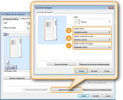 Pestaña [Configuración de página] Haga clic en [Opciones de página] Seleccione la posición de impresión de la fecha de impresión, el nombre de usuario o el número de página [Aceptar]  [Aceptar]