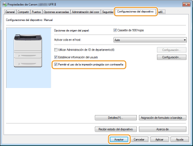 Haga clic en la pestaña [Configuraciones del dispositivo] y asegúrese de que la casilla de verificación [Permitir el uso de la impresión protegida con contraseña] esté marcada.