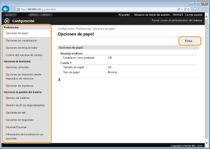 Algunas de las opciones solo pueden cambiarse si ha iniciado sesión en el modo Administrador del Sistema.
