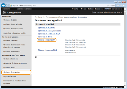 Si las direcciones IP se introducen de forma incorrecta, es posible que no pueda acceder al equipo desde la IU Remota, en cuyo caso deberá establecer <Filtro de direcciones IPv4> o <Filtro de direcciones IPv6> en <Off>. Filtro de direcciones IPv4 Filtro de direcciones IPv6