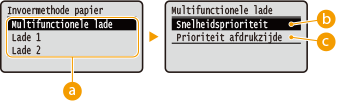 Papier), wordt de optie <Snelheidsprioriteit> gebruikt voor de papierbron. In dat geval moet u het papier laden alsof <Snelheidsprioriteit> is geselecteerd (