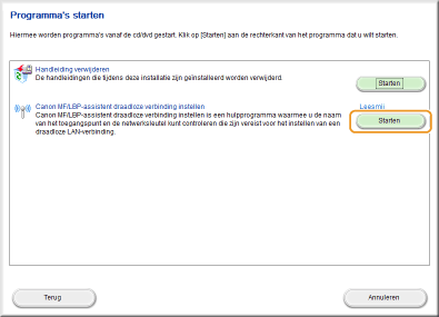Klik op [Starten] voor [Canon MF/LBP-assistent draadloze verbinding instellen].