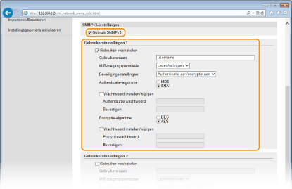 Als beide versies van SNMP zijn ingeschakeld, is het raadzaam de MIB-toegangsmachtigingen in SNMPv1 in te stellen op [Alleen lezen]. U kunt de toegangsmachtigingen voor MIB afzonderlijk instellen voor SNMPv1 en SNMPv3 (en voor elke gebruiker in SNMPv3). Als u [Lezen/schrijven] (volledige toegang) selecteert in SNMPv1, heeft dit gevolgen voor de beveiligingsfuncties van SNMPv3 omdat de meeste instellingen van het apparaat kunnen worden gewijzigd met SNMPv1.