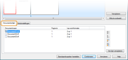 Selecteer in de lijst [Documentnaam] de documenten die u wilt combineren en klik op