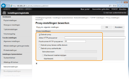 Als u het wachtwoord voor proxy-verificatie wilt instellen of wijzigen, schakelt u het selectievakje in en typt u maximaal 24 tekens voor het nieuwe wachtwoord in het vak [Wachtwoord].