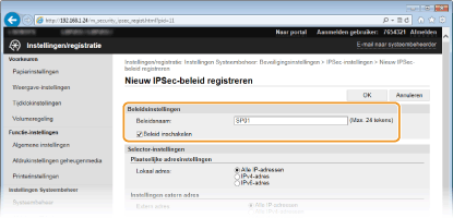 Typ in het vak [Beleidsnaam] maximaal 24 alfanumerieke tekens als naam voor de set met beleidsinstellingen.