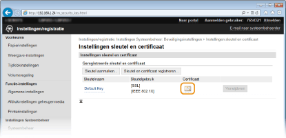 Klik op [Beveiligingsinstellingen]  [Instellingen sleutel en certificaat] of [Instellingen CA-certificaat].