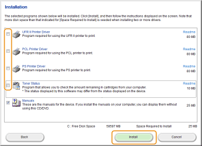 Desmarque todas as caixas de verificação exceto [Manuals] (Manuais) e clique em [Install] (Instalar).