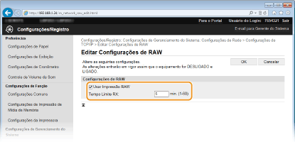 Selecione a caixa de verificação para imprimir através de RAW. Quando não pretender utilizar a impressão através de RAW, desmarque a caixa de verificação. [Tempo Limite RX]