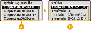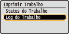 .![]() <Imprimir Log de Trabalho>Apresenta uma lista dos documentos que foram impressos. <OK> aparece quando um documento é impresso com êxito e <Erro> aparece quando um documento não é impresso por ter sido cancelado ou devido a um erro.