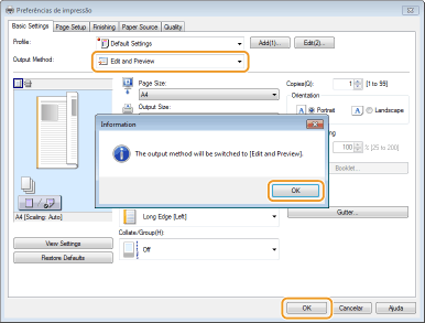 Selecione [Edit and Preview] (Editar e Pré-visualizar) em [Output Method] (Método de Saída).