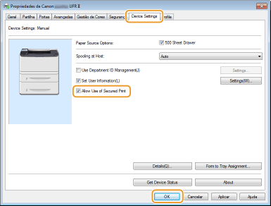 Clique no separador [Device Settings] (Definições do Dispositivo) e certifique-se de que a caixa de verificação [Allow Use of Secured Print] (Permitir Utilização de Impressão Protegida) está selecionada.