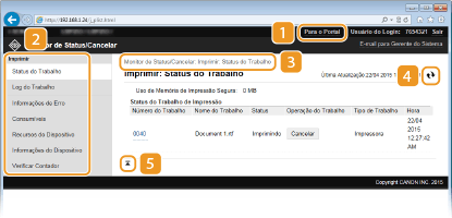Apresenta a página [Monitor de Status/Cancelar]. Pode utilizar esta página para verificar o estado de impressão, cancelar a impressão e ver o histórico dos trabalhos de impressão.
